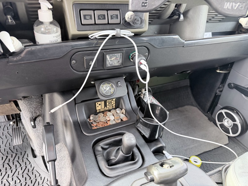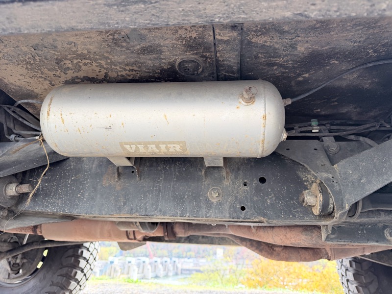 Custom on-board air system repurposing A/C compressor for tools and tire inflation with frame-mounted tank and dash-mounted gauge